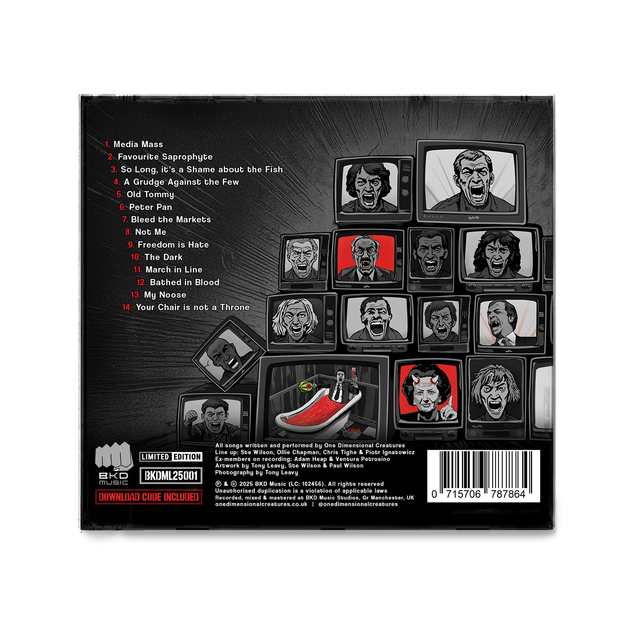 TOLERANCE PARADOX - The debut album from ONE DIMENSIONAL CREATURES. Featuring 9 singles and 5 unreleased tracks the album showcases the band’s diverse sound. The album is a snapshot of recent political unrest, each track wrestles with the chaos of modern tolerance in a world that’s anything but. Dealing with issues of wrongful wars, addiction, inequality, neoliberalism, and racism with moral anger. The record is a sonic rebellion to a world controlled by rich parasites. Distorted heavy guitars and booming bass juxtapose the melodic vocals with background shouts that give a feel of a street protest. It’s a distorted manifesto unapologetically calling for the end of capitalism and inequality. Think punk fury with a philosopher’s edge, grunge grit soaked in post-punk paranoia, a thinking person’s album. It’s loud, it’s smart, it’s unapologetically alive.